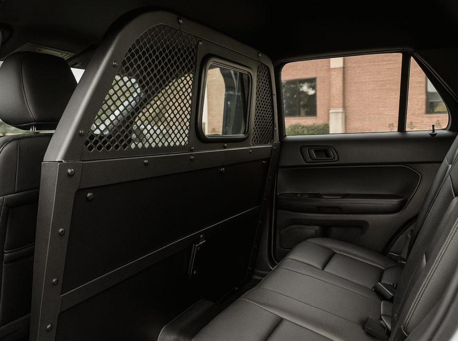 Protective front-to-rear partitions and reinforced door panels to enhance officer safety and detainee control in transport vehicles.